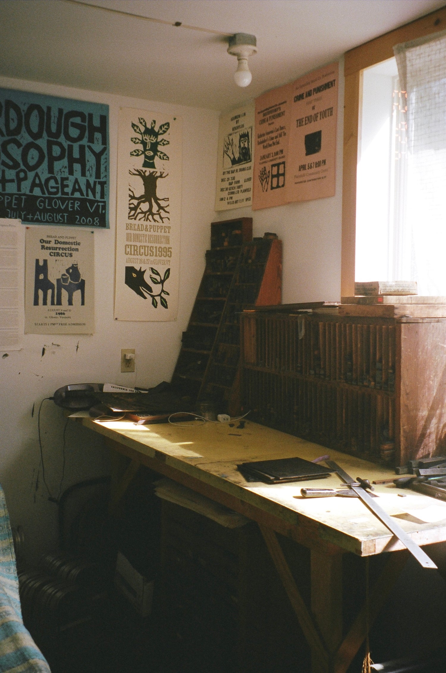 At the print shop, Bread + Puppet Press team members and local volunteers make all the hand-printed and painted items for sale, including letterpress broadsides and handmade books. The Print Shop also produces the banners, flags, curtains, and costumes, as needed, for specific shows and events. At the Bread + Puppet Press, pieces from Peter's huge oeuvre are selected and used to design the books, posters, and cards, and work with local offset printers to produce each item, usually in editions of 1,000 or fewer.
