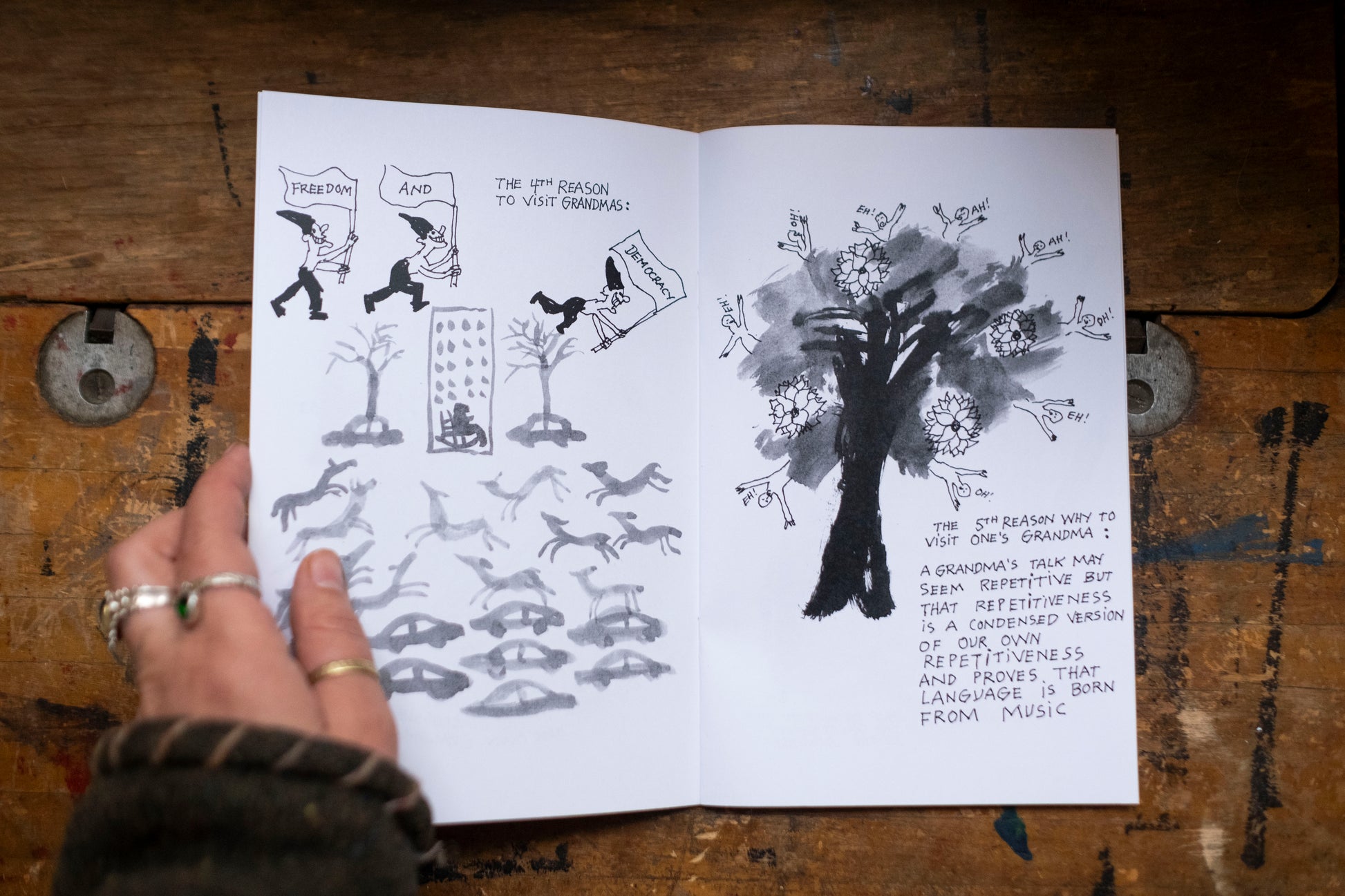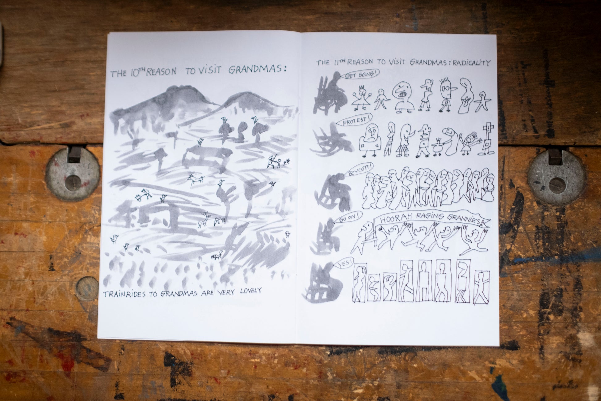 This book was created from images hand drawn by Peter Schumann for the 2004 Calendar, 12 Reasons to Visit Grandmas. The 2025 circus featured an act based off of this book as well.