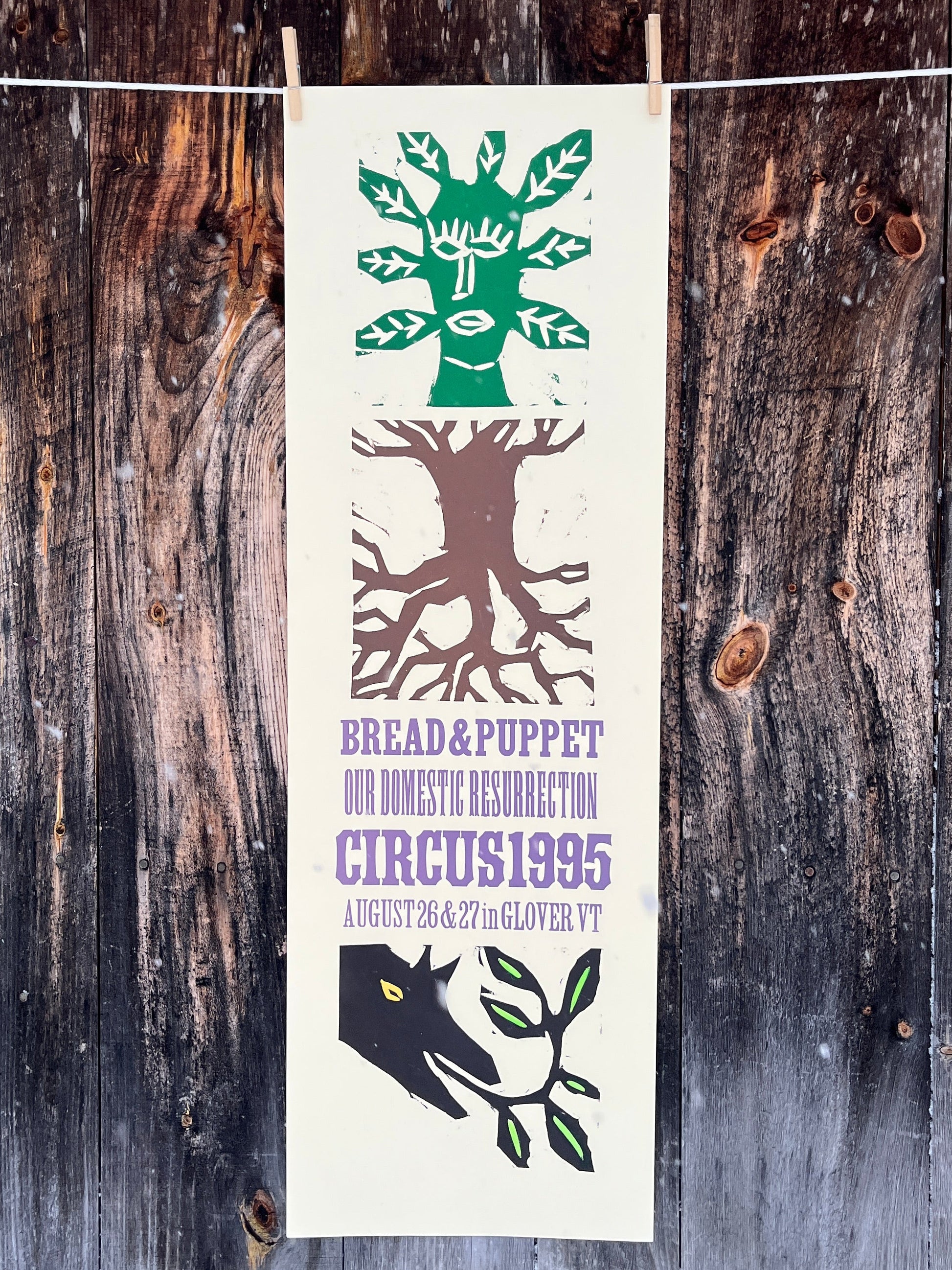 This gorgeous poster was designed and printed in 1995 for the summer circus. It features three masonite carvings by Peter Schumann, letterpress type set and printed on our Vandercook SP-20. Each poster also has handpainted elements.