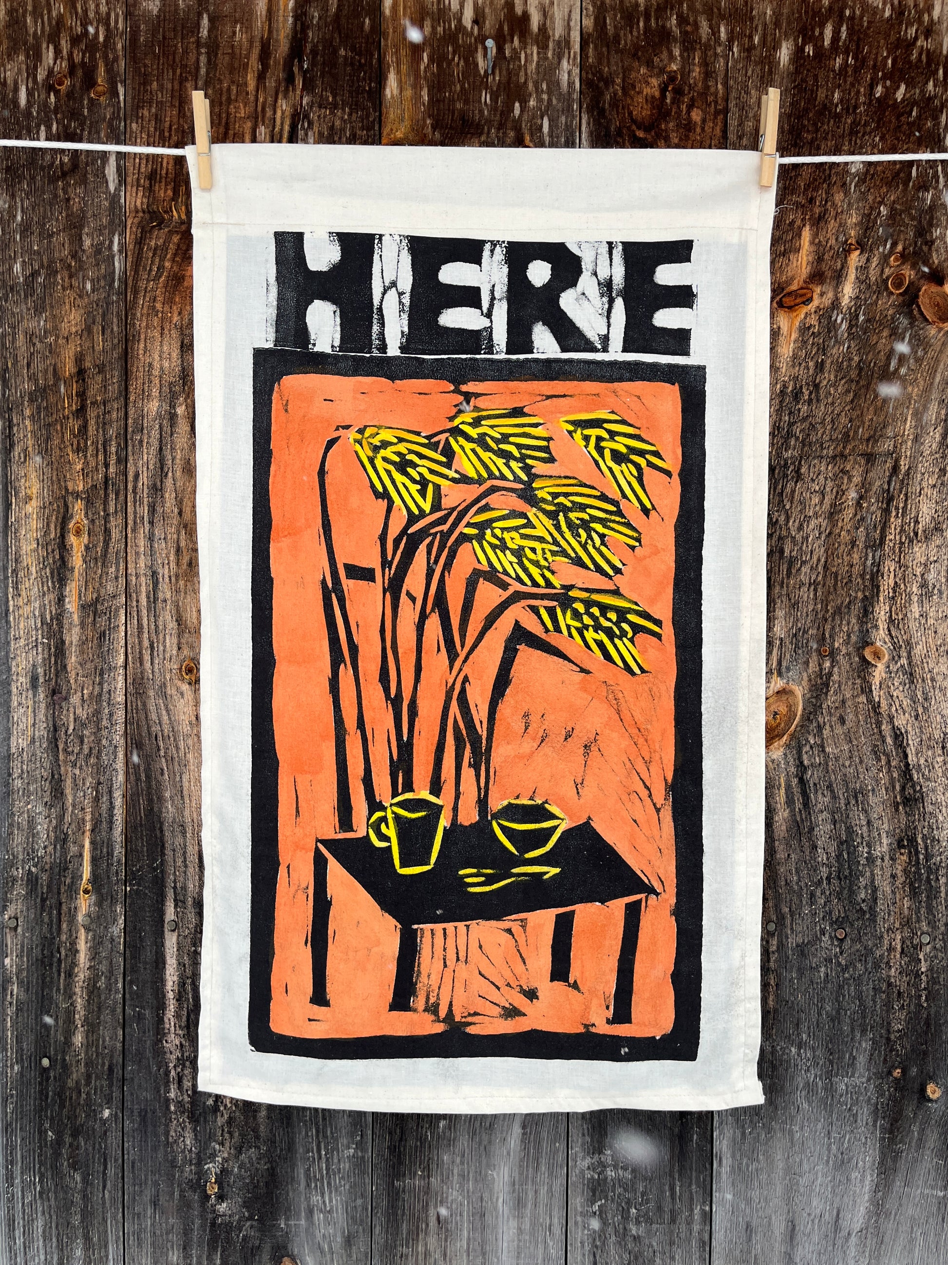 Banners are hand printed from Peter Schumann’s masonite cuts and are painted and sewn-by-hand in our print shop, in Glover, Vermont (and with the help of local volunteers). These banners are made with printing ink on unbleached cotton.