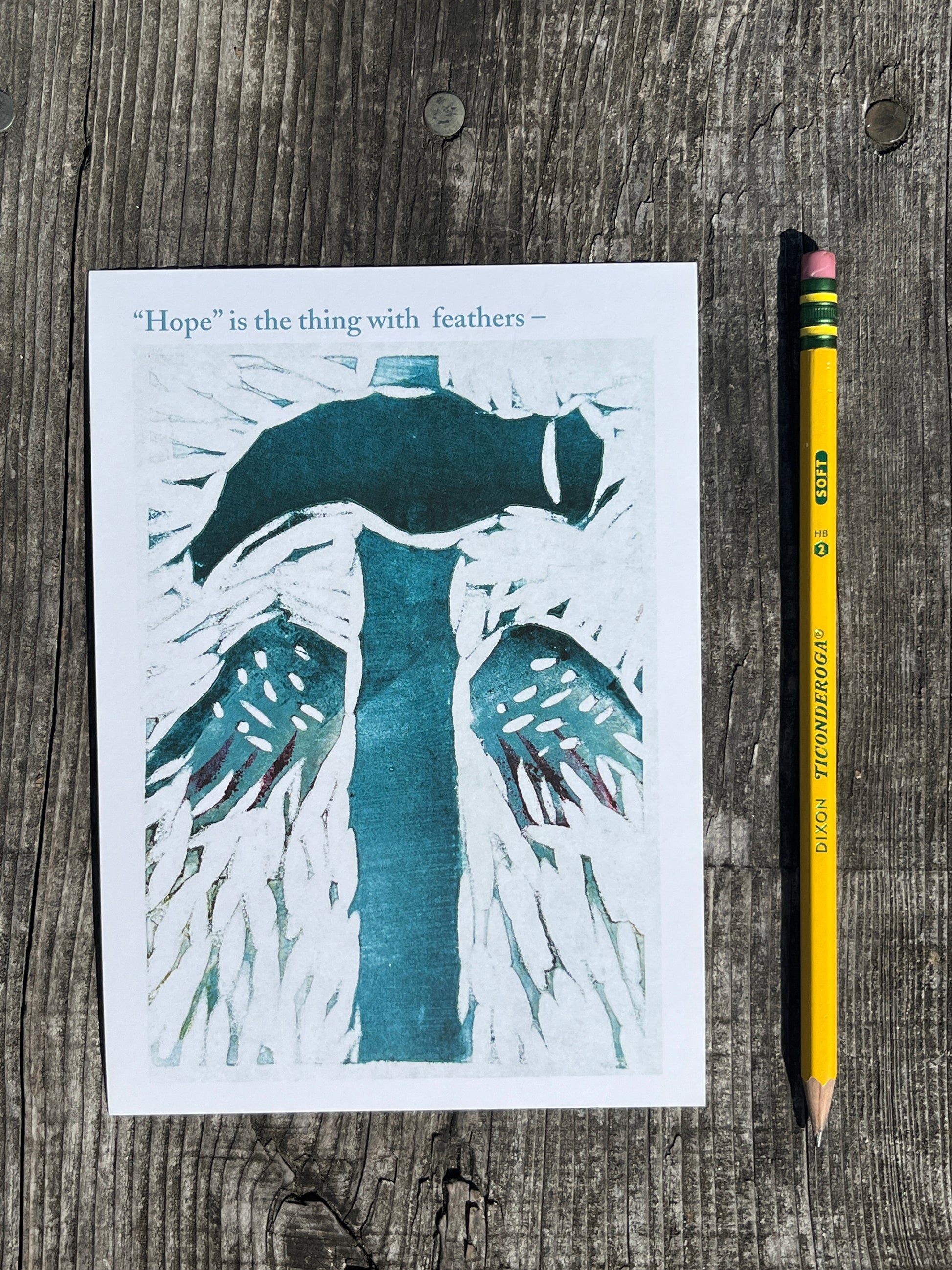 Color offset postcard of Peter Schumann's masonite cut from the 2016 Overtakelessness Calendar. Features text from an Emily Dickinson poem originally printed using the Vandercook Press at the Bread + Puppet Press.