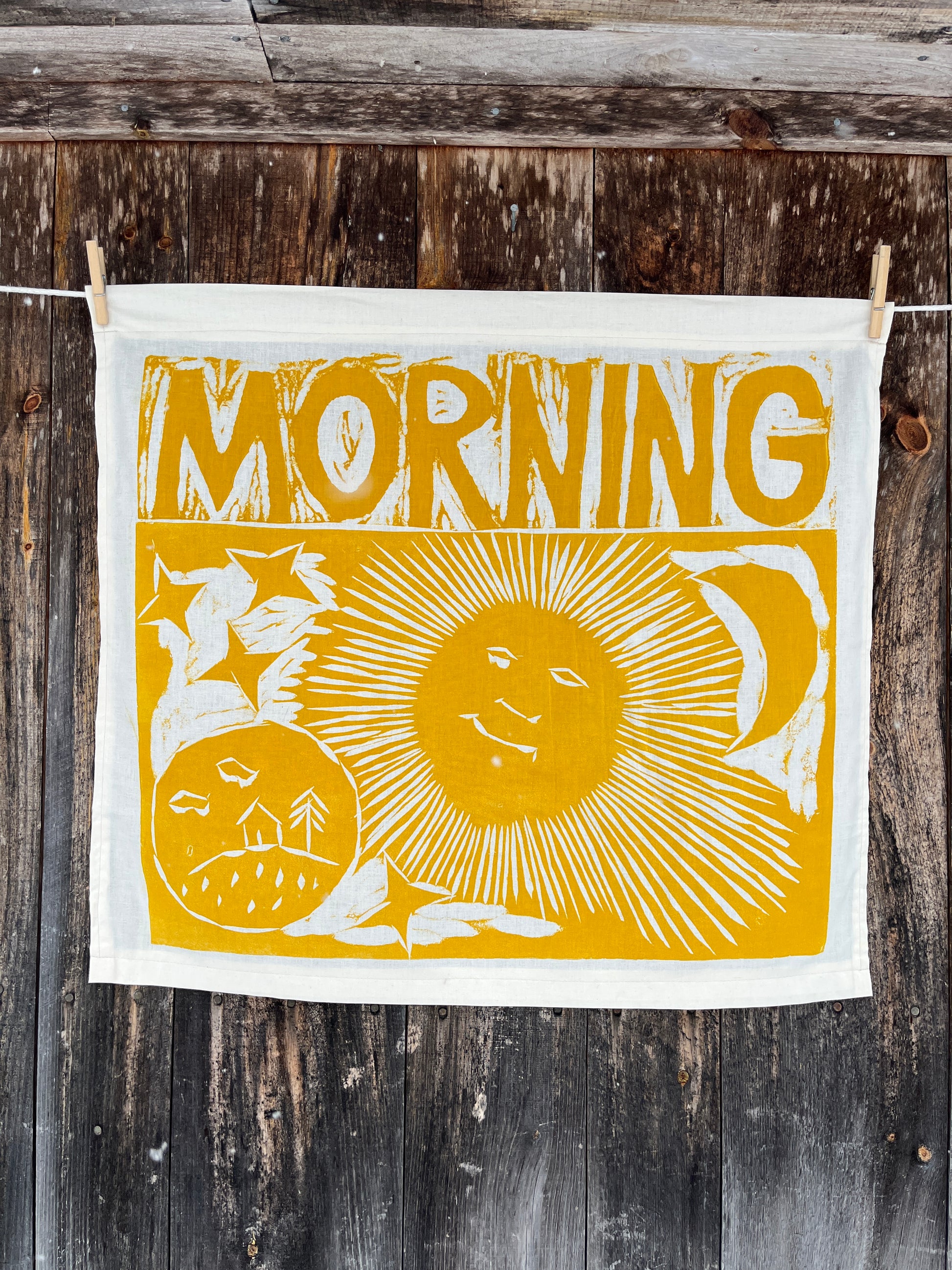 Morning Sky features a smiling sun surrounded by a moon, stars, and earthly image.