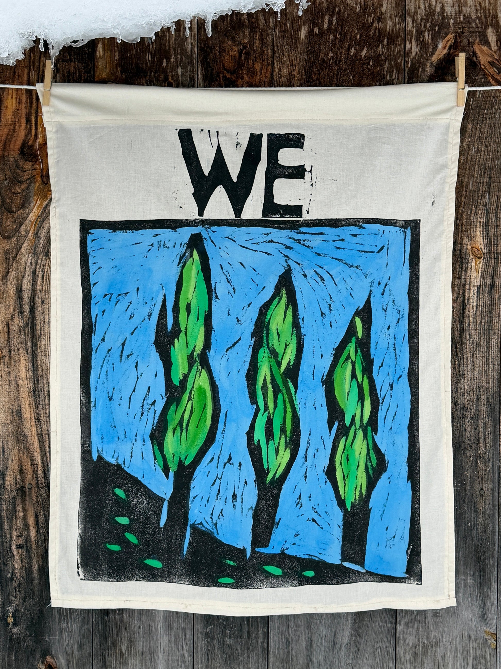 Banners are hand printed from Peter Schumann’s masonite cuts and are painted and sewn-by-hand in our print shop, in Glover, Vermont (and with the help of local volunteers). These banners are made with printing ink on unbleached cotton.