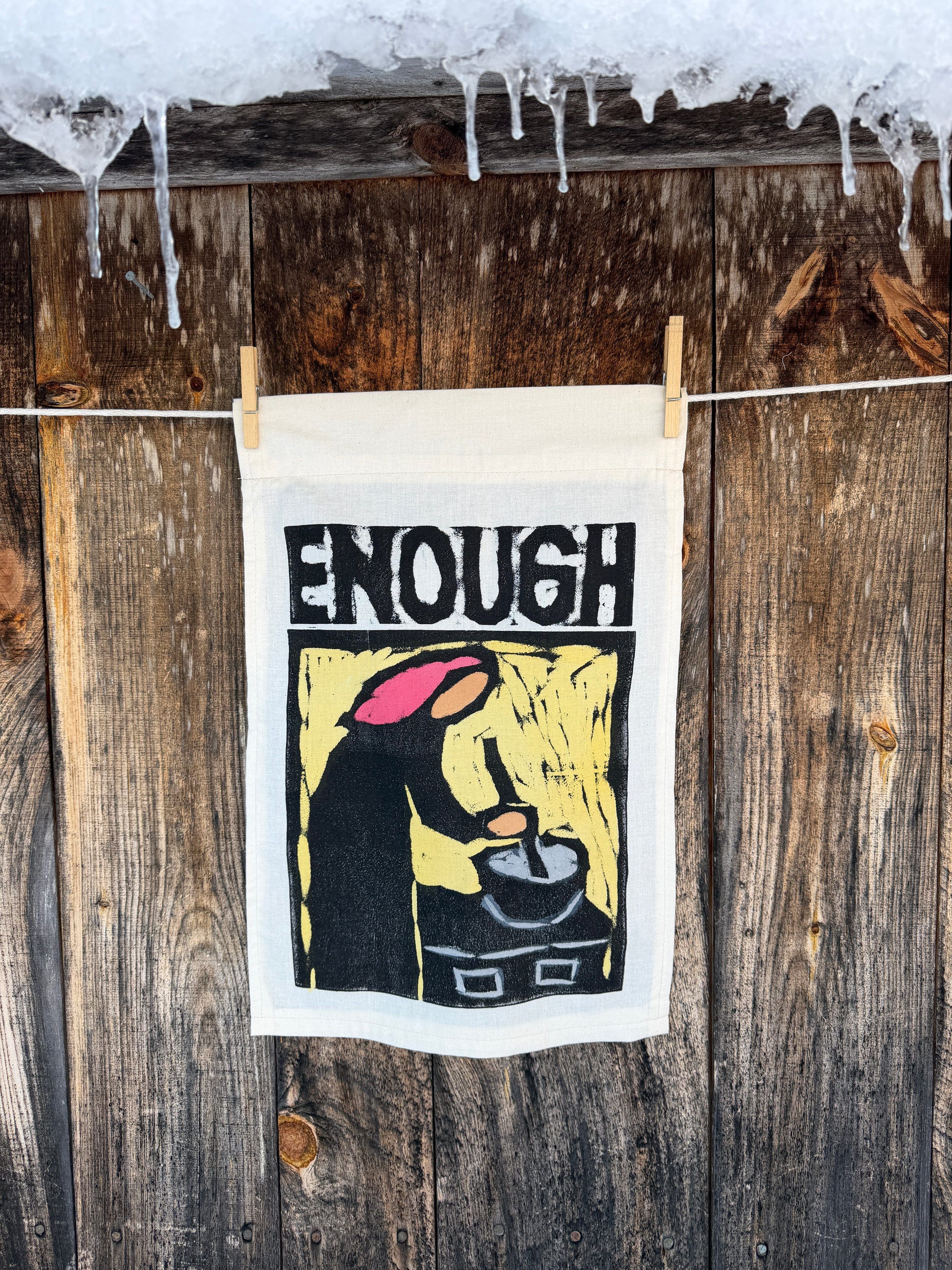 Banners are hand printed from Peter Schumann’s masonite cuts and are painted and sewn-by-hand in our print shop, in Glover, Vermont (and with the help of local volunteers). These banners are made with printing ink on unbleached cotton.