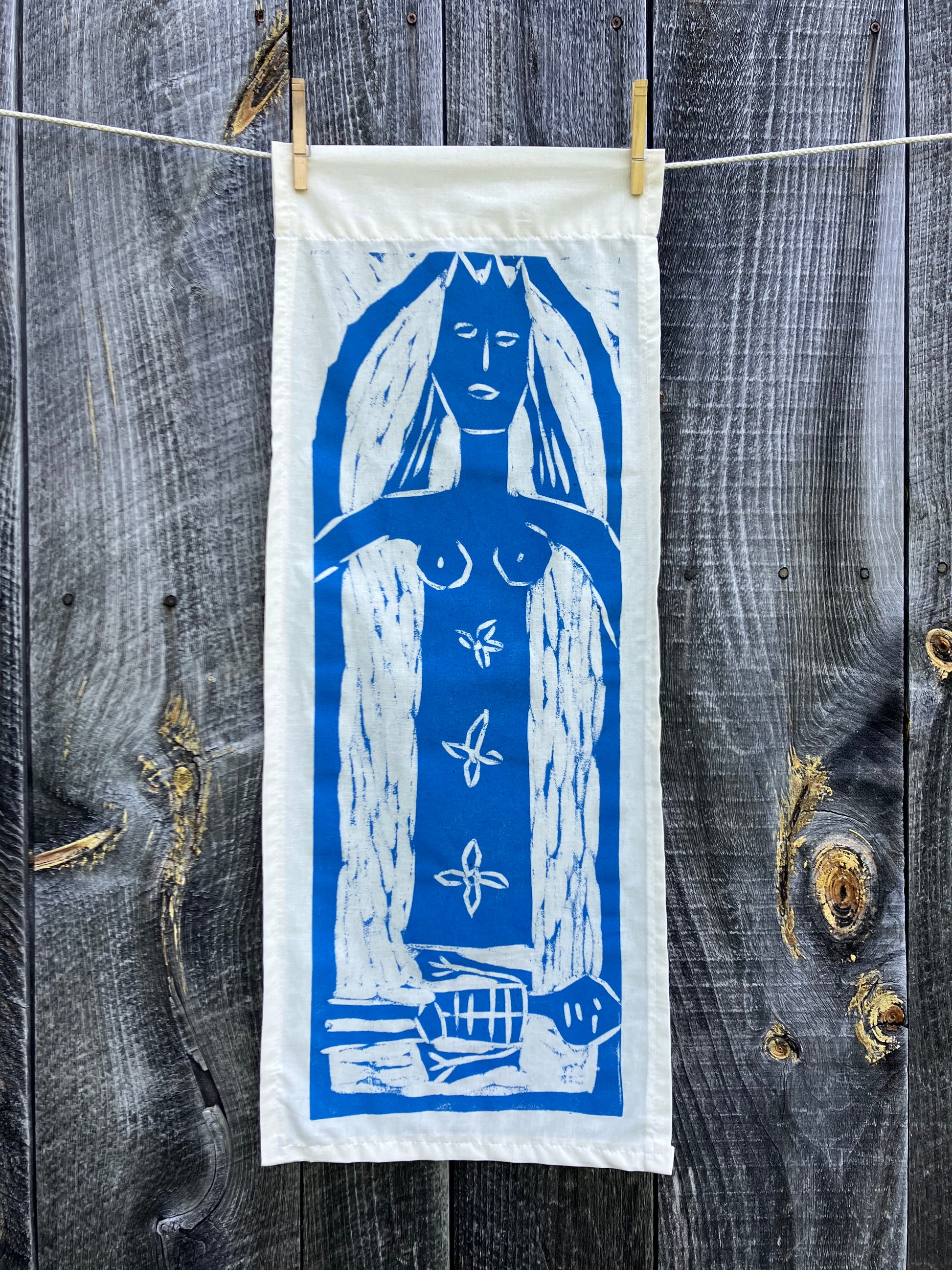 Banners are hand printed from Peter Schumann’s masonite cuts and are painted and sewn-by-hand in our print shop, in Glover, Vermont. Banners are made with printing ink on unbleached cotton, unless otherwise stated.